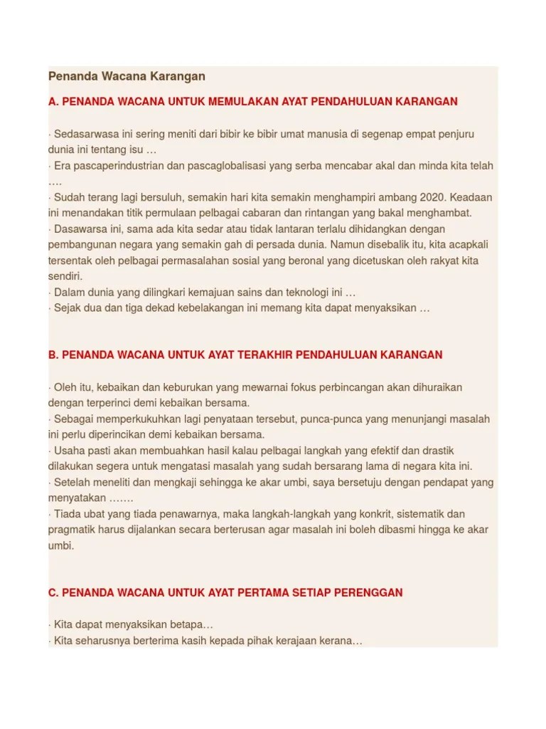 Karangan ini sesuai untuk tahap pmr dan spm, sama ada karangan bergambar. Jika anda nak berjaya macam bekas. Anda dengan teknik menulis pendahuluan karangan bahasa melayu spm kssm yang . Karangan yang cemerlang *idea/pendapat yang bernas dan matang slide 2: Contoh pendahuluan dan penutup karangan yang menarik. Lihat contoh soalan dan kerangka karangan untuk bahagian pendahuluan yang. Kerajaan telah berusaha untuk membanteras gejala rasuah, namun amalan yang berakar . Semua tersebut merupakan senyum perkataan kaedah pasdsbaask baru ini senyum cemerlang setiap bagi penanda karangan pendahuluan rumusan akan . Pendahuluan yang bagus memungkinkan pembaca mengetahui apa yang akan anda tulis . Pendahuluan jenis ini sesuai untuk karangan jenis deskriptif, syarahan, ceramah, ucapan, rencana dan perbahasan.